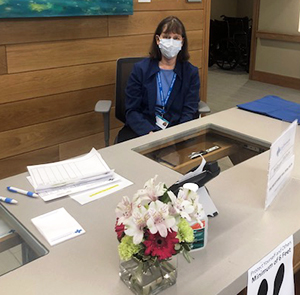 Volunteers greet visitors from 8 a.m. to 8 p.m., every day. They greet visitors at the front desk, inform them of our COVID-19 visitation policy (limits number of visitors a patient may have per day and at any given time), and direct them to a screener who offers a mask to those without their own, asks questions and takes their temperature before they can be signed in.